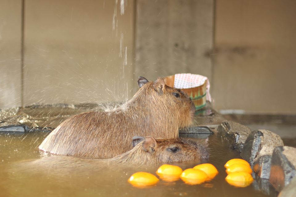 ▼水豚泡在溫泉中享受的模樣,成為了這間公園人氣最高的景點。飼育員還會在溫泉湯中「加料」,有時是柚子,有時是蘋果,還有柑橘,讓水豚盡情享受。這一活動會進行到2020年4月5日。