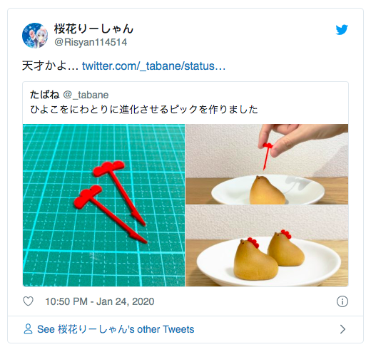 如果你經常去日本旅行,應該對「名菓ひよ子」很熟悉吧。這是一種小雞造型的甜饅頭,不僅長得可愛,吃起來也很美味,是人氣非常高的伴手禮。最近一位推主在小雞饅頭上加了一點創意,它瞬間進化,從小雞變成了大公雞。