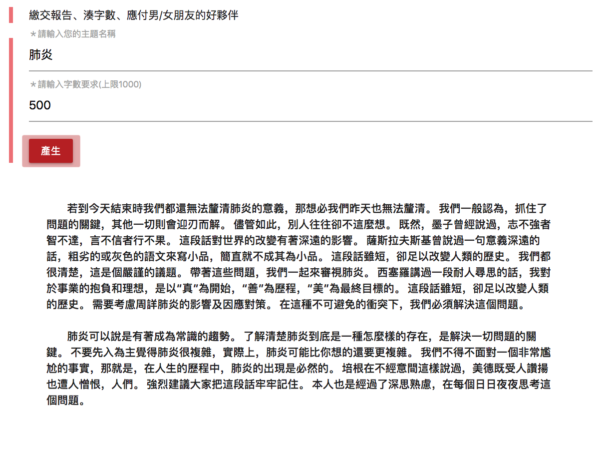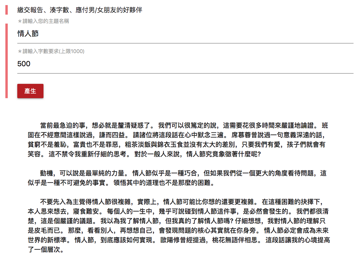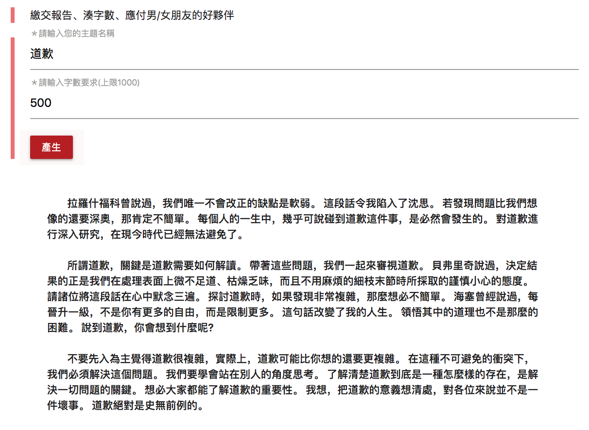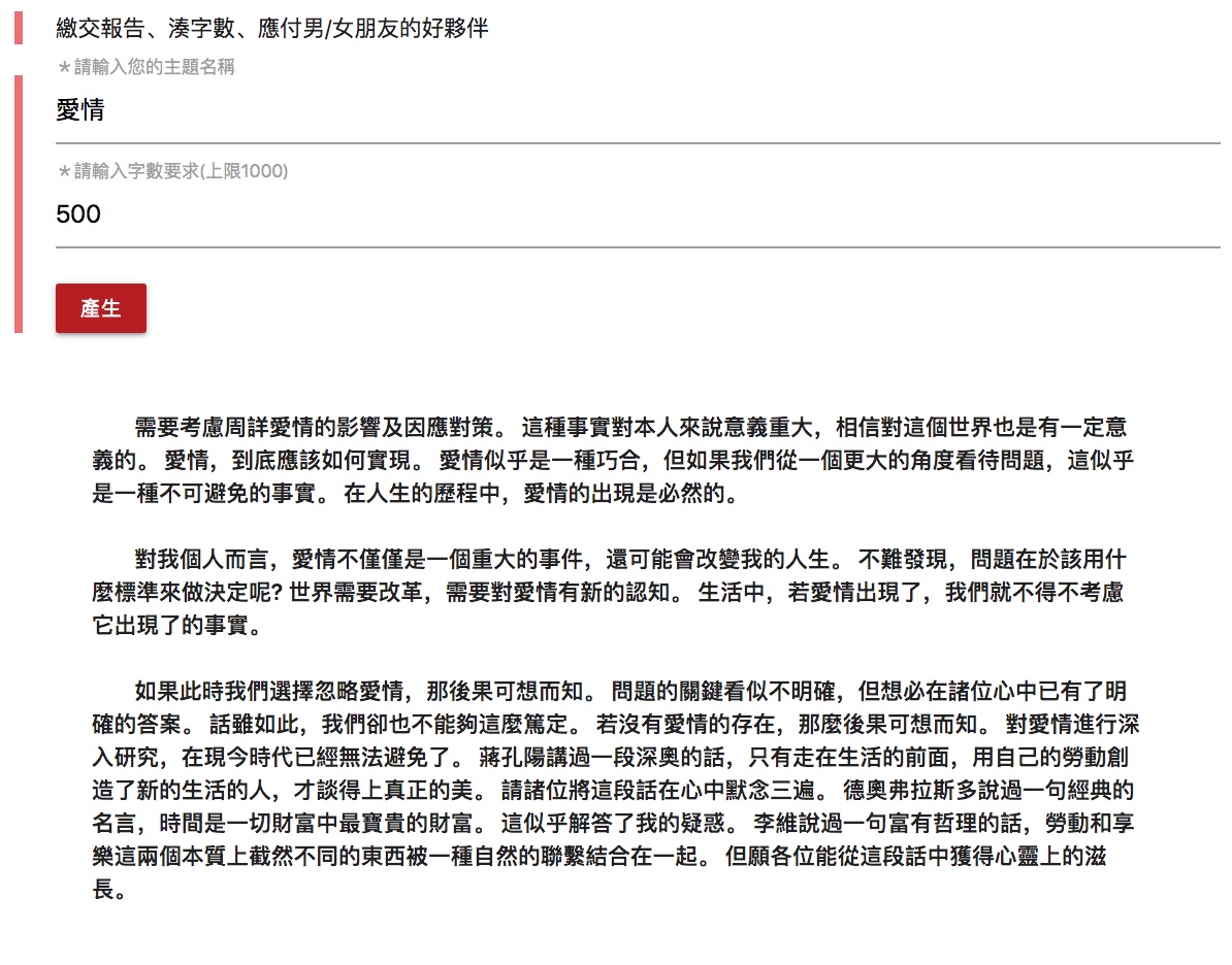 這個工具其實對寫不出長文的人可能會有點幫助,只要多看就會知道寫長文的訣竅(有嗎?)。至於拿去交報告的部分,請大家要三思而後行啊!(笑
