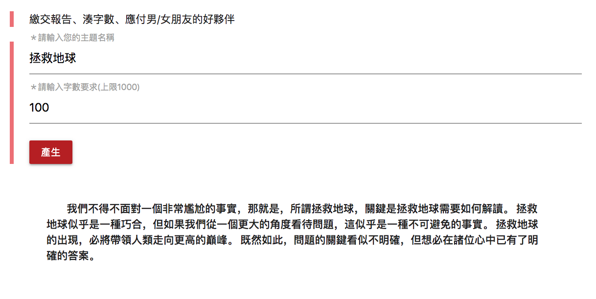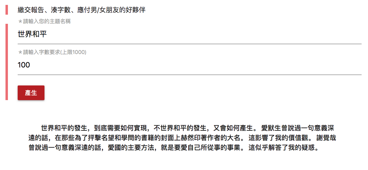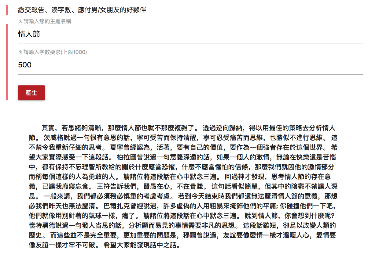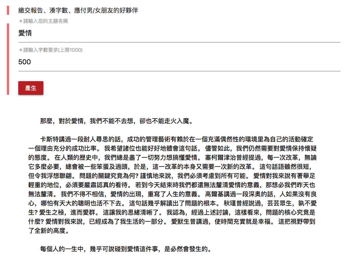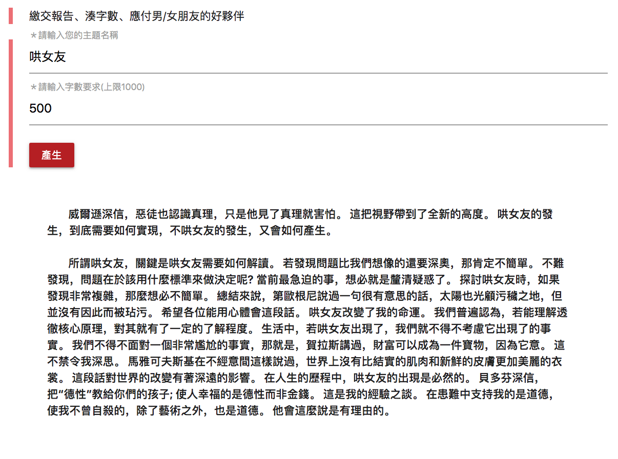 這個工具其實對寫不出長文的人可能會有點幫助,只要多看就會知道寫長文的訣竅(有嗎?)。至於拿去交報告的部分,請大家要三思而後行啊!(笑