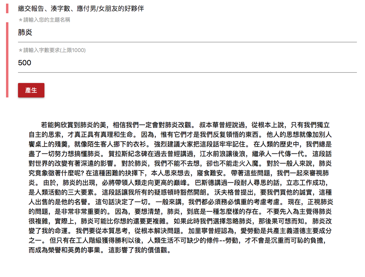 2020年01月29日人生就是要耍廢才會過得健康又快樂~網友徐子修開發的「唬爛產生器」只要輸入主題名稱與字數要求,不到幾秒的時間內就可以產出一堆「看似合理」的長文,讓你不再害怕面對交報告,甚至連應付另一半也可以得心應手!