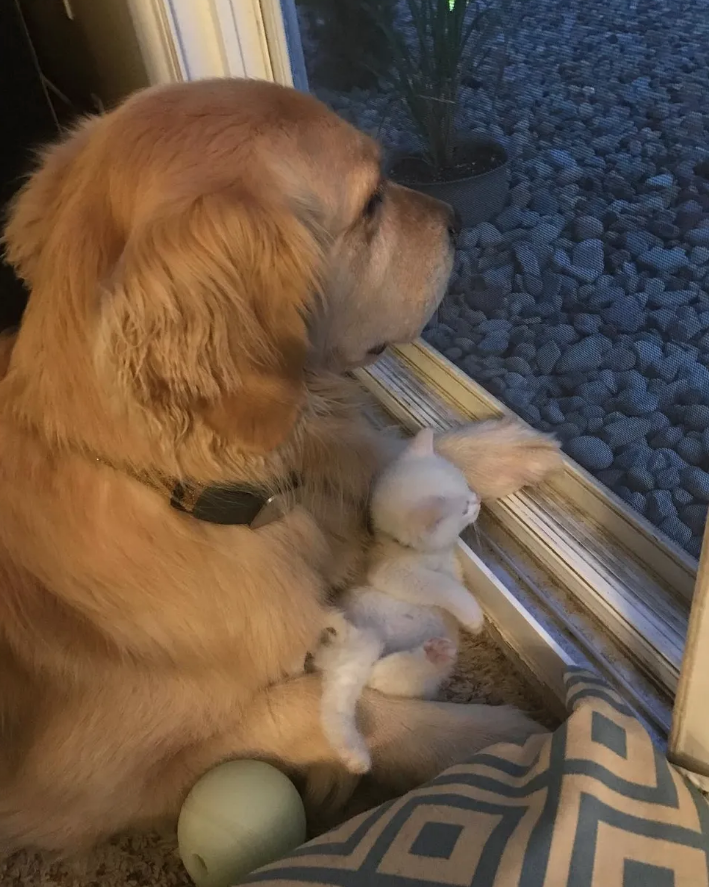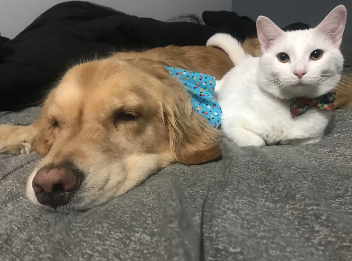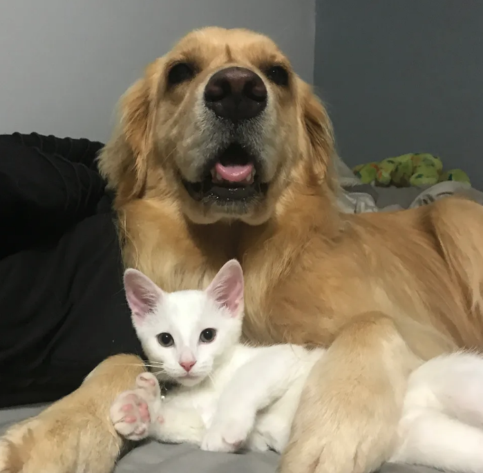 2020年01月29日外國女子 Kim Downie 的丈夫在動物醫院工作,當她的丈夫發現一隻3個月大的小白貓被留在醫院時,很快就決定要帶牠回家!一開始還有點擔心家裡的黃金 Mojito 會不會接受小白貓,但是幾天後他們就看見小白貓和 Mojito 相處得就像是家人一樣了!