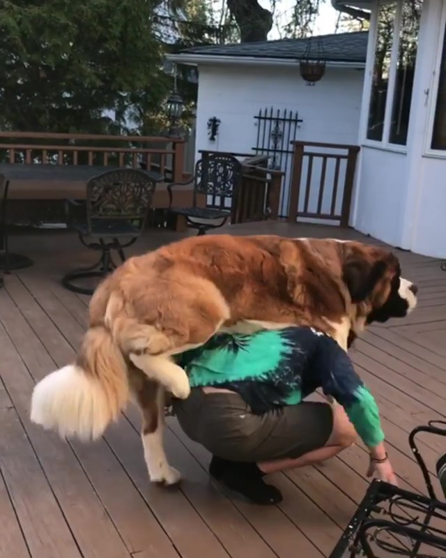 2020年02月03日毛孩天生愛撒嬌,也許在牠們心中,不管自己長多大,都應該是主人的小寶寶。美國一隻叫Midas的2歲聖伯納犬,牠小時候體型小巧,爸爸經常將牠抱在懷裡,或者背著牠玩。現在牠已經長大,還是喜歡找爸爸討抱、討揹,爸爸都要被牠壓垮了。