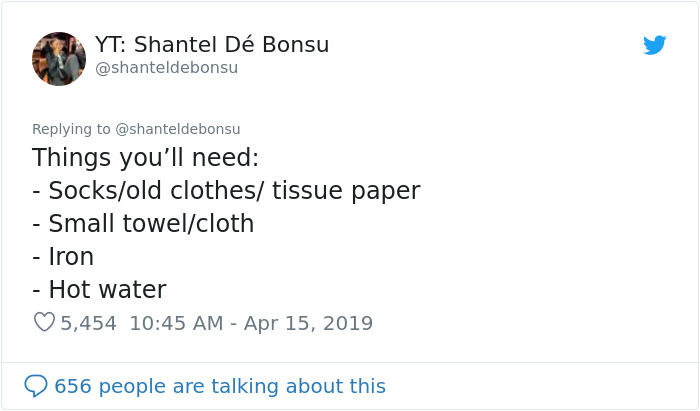 ▼她首先準備這些東西:舊襪子/舊衣服/衛生紙、小毛巾、熨斗、熱水。