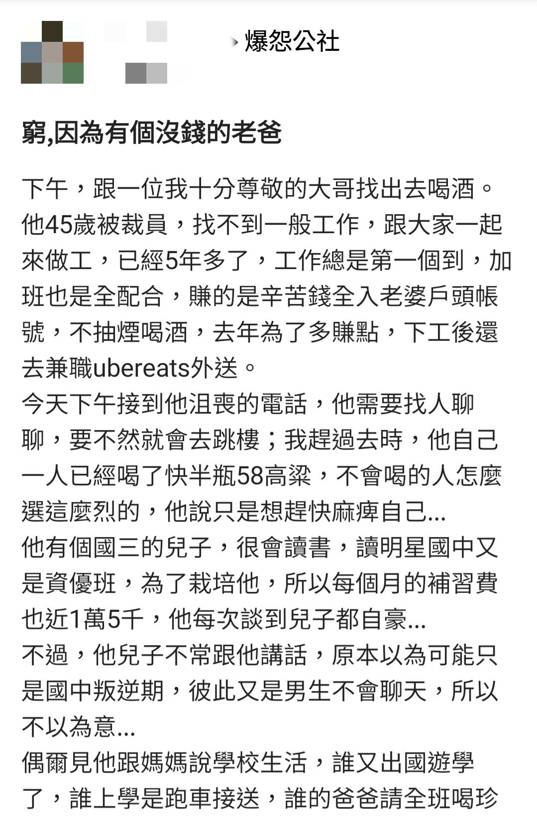 ▼原po表示這位朋友45歲被裁員,為了讀明星國中資優班的兒子出來做工還兼職外送。某天下午,這位朋友撥電話給他表示想不開想跳樓,一個人喝了半瓶58高粱。