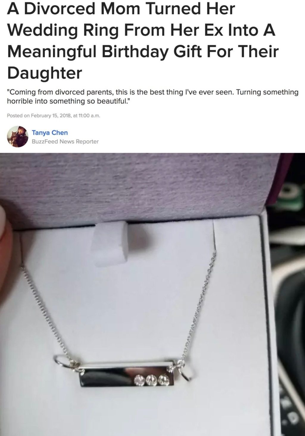 ▼​2.這位單親媽媽把婚戒做成項鍊送給女兒,項鍊上的鑽石就是婚戒上的鑽石。女兒說:「媽媽告訴我,雖然她和爸爸的婚姻沒有成功,但他們都認為我是他們從這段關係中得到的最棒的禮物。」