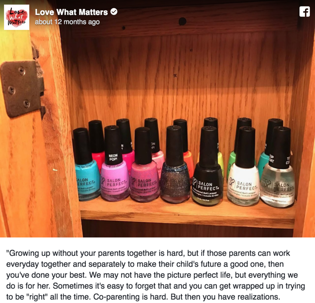 ▼​9.這位媽媽也很感激前夫:「孩子沒有父母陪伴,成長的過程並不容易。但如果父母分手後還能合作,一起為了孩子的未來而努力,那就不一樣了。昨天女兒跟我說,我要跟她爸爸一樣買更多指甲油。我好奇問她爸爸做了什麼,她傳給我這張照片,那裡足足有14瓶指甲油,她可以挑自己喜歡的顏色。雖然我跟前夫分手了,但女兒仍能夠感受到完整的愛。」