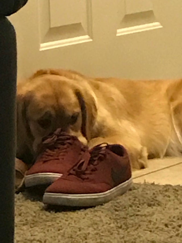 ▼首先,穿過的鞋子往往帶有主人的專屬味道,嗅覺敏銳的狗狗很喜歡這種熟悉的味道,根本抗拒不了。