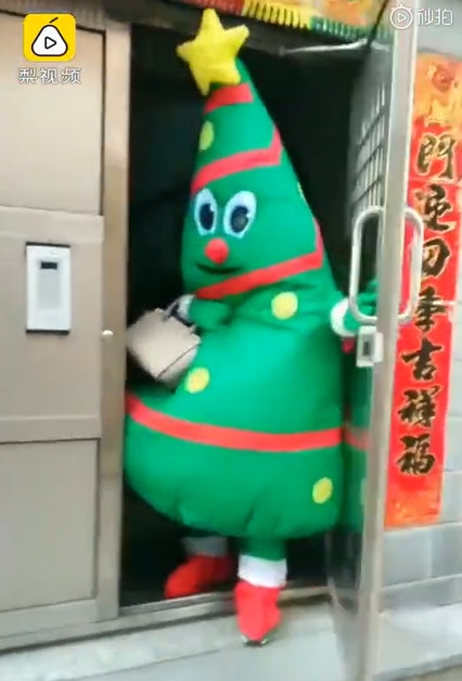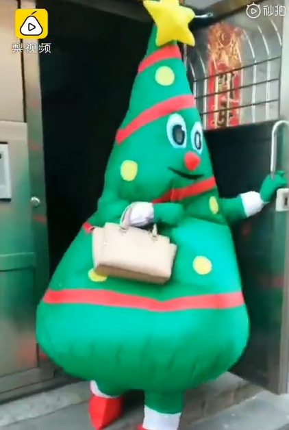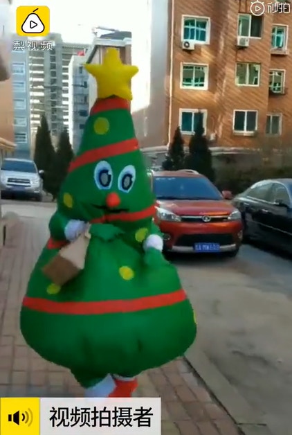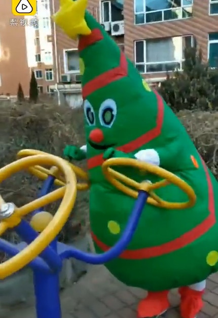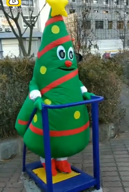 ▼大媽穿上充氣服,變身一棵綠色的聖誕樹。這棵聖誕樹上還有大大的眼睛、紅色的鼻子和嘴巴,看起來很可愛。