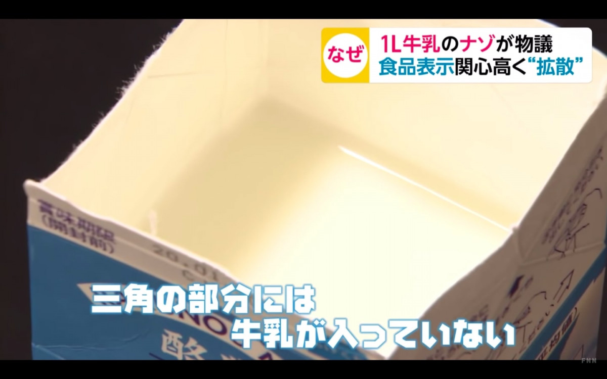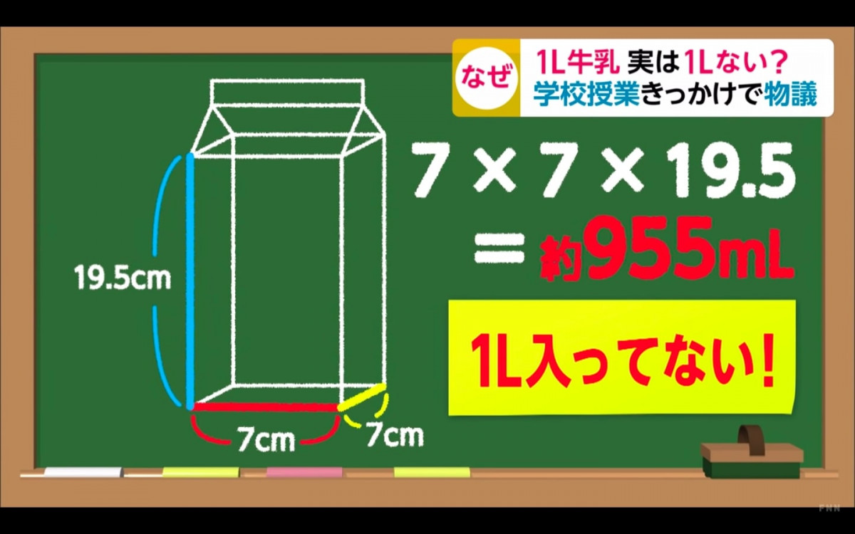 ▼這個問題不僅讓學生們百思不得其解,還引發網友討論。就連Yahoo! News和電視台也通過節目驗證「牛奶盒容量之謎」。富士電視台的「Live News it!」首先根據牛奶盒的尺寸,得出955ML容量的結果,這跟前田健太老師的結論一樣。也就是說,常規的牛奶盒是不能容納1L牛奶的。