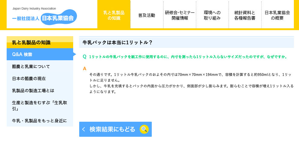 ▼日本乳牛協會早就解釋過這個問題。他們表示,雖然牛奶盒的測量結果顯示容量只有950ML左右,但把牛奶倒滿盒子時會給盒子壓力,側面稍微膨脹,這樣就增加了容積,也就能倒入1L牛奶了。
