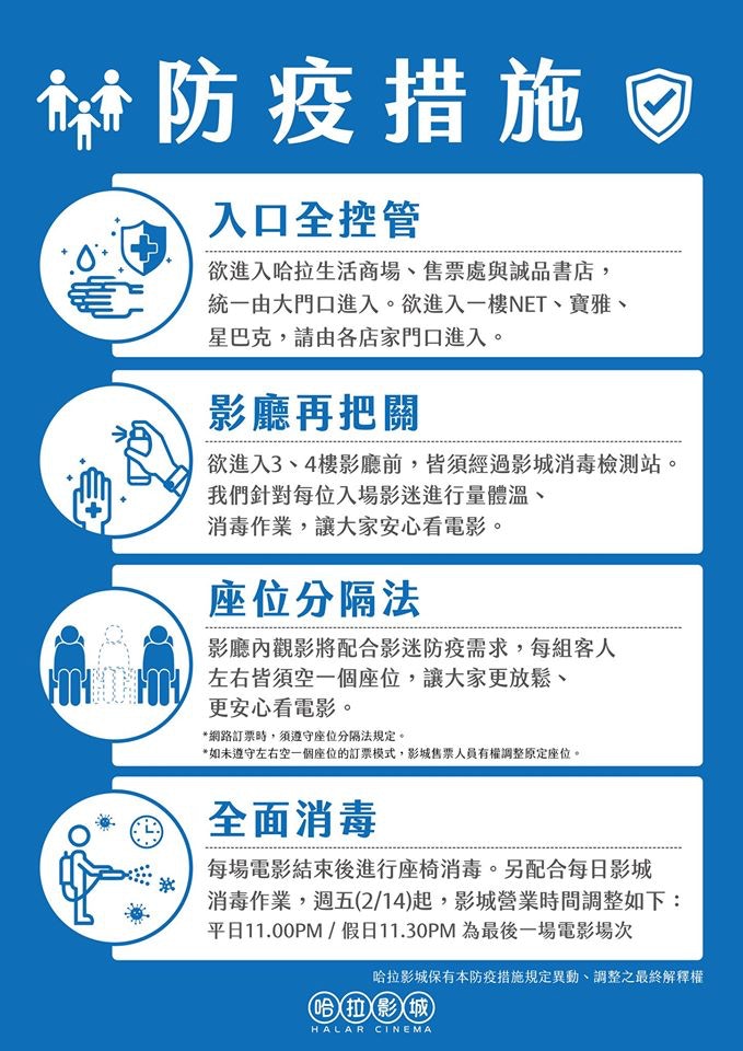 ▼哈拉影城在臉書貼出公告:「自11月11日起,影院內採取『座位分隔法』,每組客人左右相隔一個客人,使用網絡購票的客人也需符合該項規定。若未遵守該項規定,影城售票人員有權調整原定座位。請大家安心放鬆看電影。」