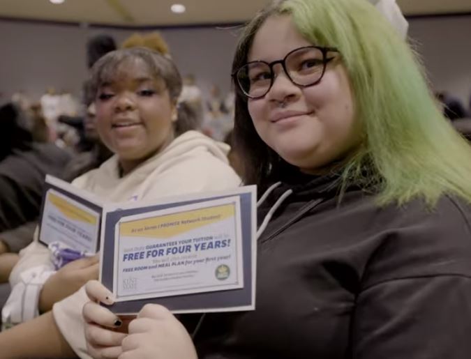 ▼最近「I Promise」學校的193名高中生參觀了俄亥俄州東北部的肯特州立大學(Kent State University)。學生們不知道,這場普通的校園參觀之旅中還有一個大驚喜。他們聽演講時突然被告知椅子下有一封信,原來那是一份免去大學4年學費,還有第一年住校食宿費的通知書。