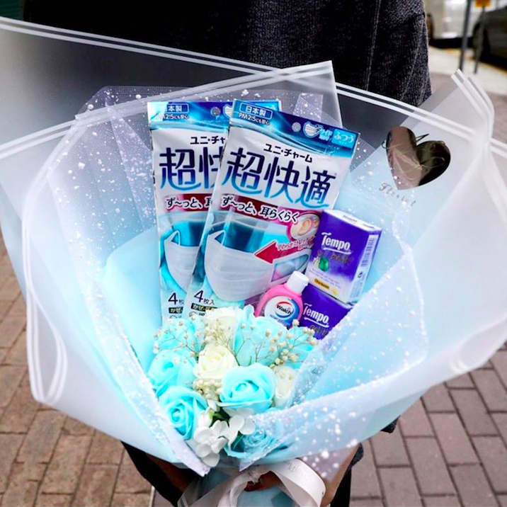 ▼「口罩花」中有10支香皂花,分為粉紅色、粉藍色和深粉紅色三款,還有2包日本「超快適」口罩,共有8個口罩、4包紙巾和2支乾洗手,價格為港幣599元(約台幣2,315元)。買家也可以選擇鮮花代替。