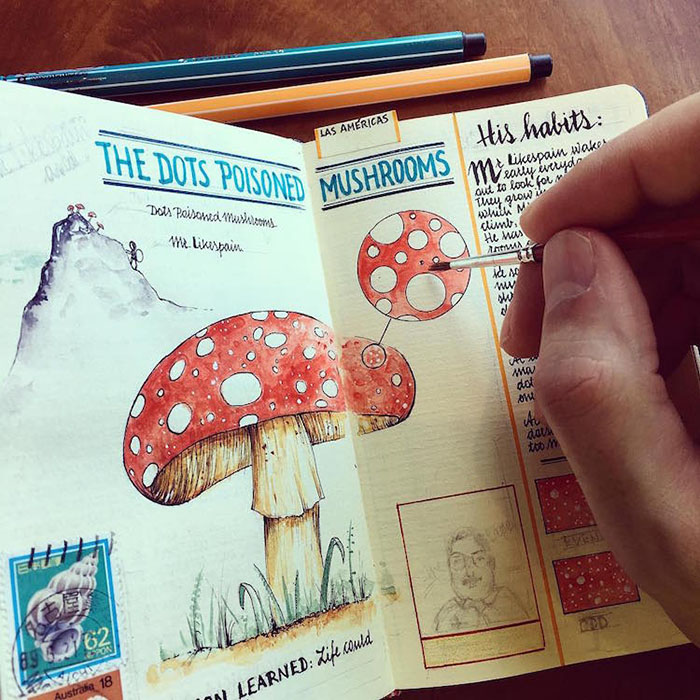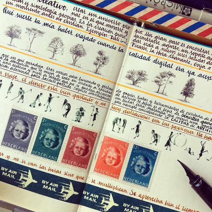 ▼Jose Naranja以前沒有學過繪畫,但他天賦驚人,能運用水彩、鋼筆在本子上畫畫。他還會加入拍照元素,或貼上郵票,再搭配手寫的文字,讓筆記本看起來更精彩,簡直就像專業的旅遊雜誌。