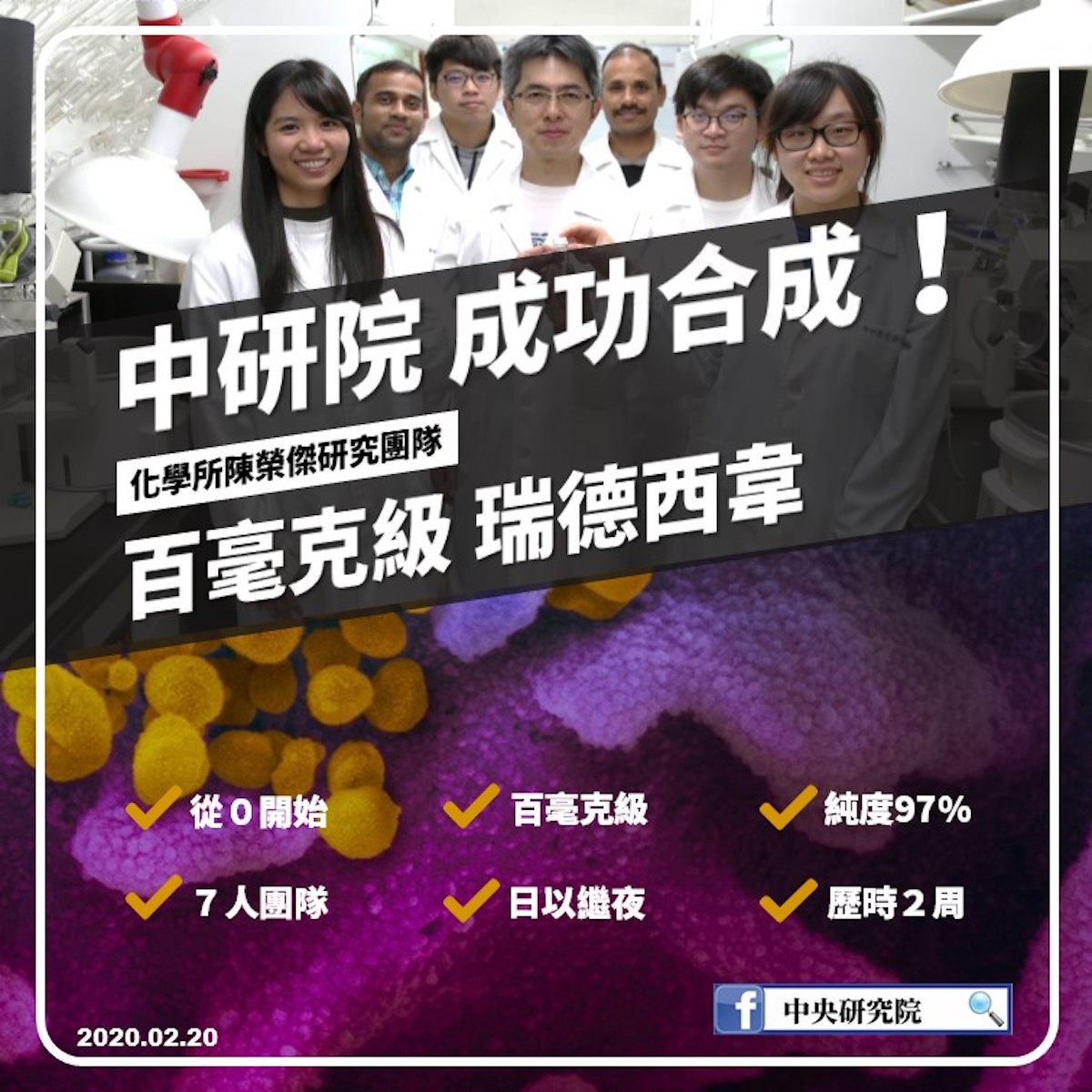 ▼中研院在Facebook發表消息,報告只有7人的研究團隊僅僅花了2週時間,就從無到有自己合成出「百毫克級」瑞德西韋,純度達97%,未來可以應用在藥物中對抗疫情。