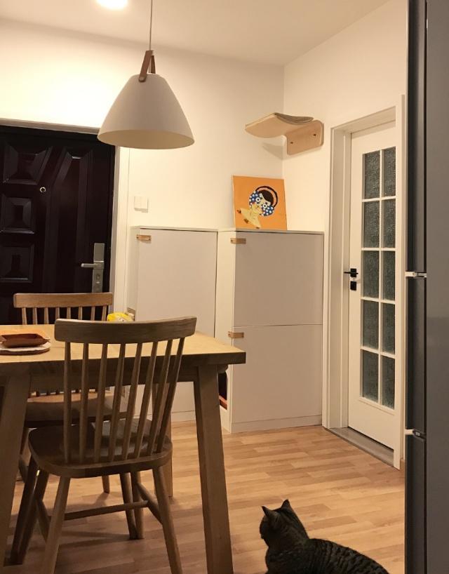 ▼現在房子的地面鋪設著溫馨舒適的木地板,原本擺放冰箱的區域訂做了時尚的鞋櫃,增加入戶收納空間。再加上全新的原木風格餐桌椅,整體非常溫馨。