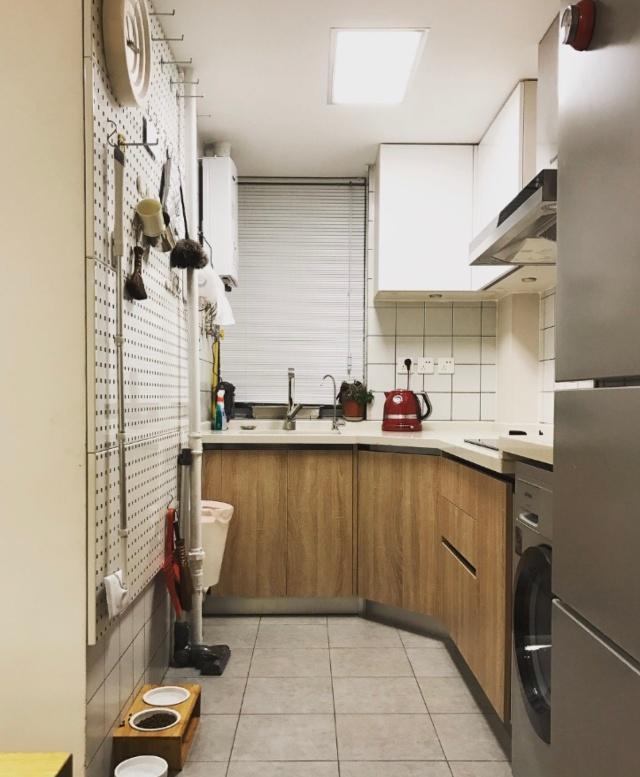▼廚房做成了開放式的,將洗衣機和冰箱放置在這裡,比放在門口更節省空間。餐廚空間和內部的臥室、客廳用深色的簾子隔開,做料理的時候可以屏蔽油煙。