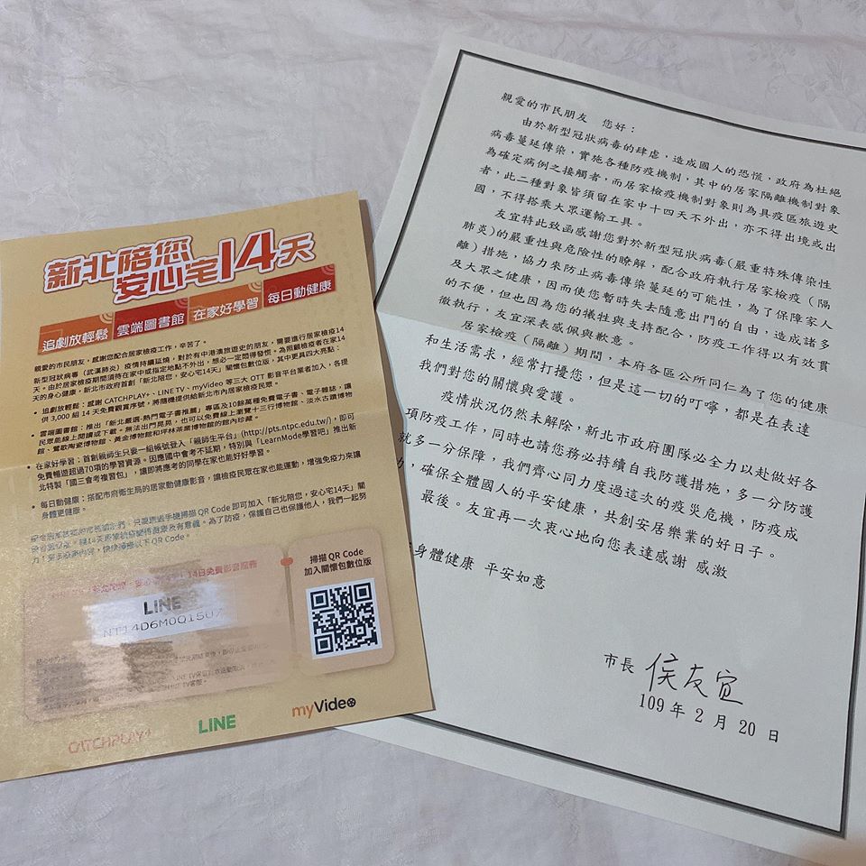 ▼「居家防疫關懷包」裡有什麼呢?除了14片口罩,衛教資訊傳單和市長關懷信印刷物,還有CATCHPLAY+、myVideo、LINE TV隨機一種影音平台的14天免費觀賞序號,3大影音平台分別提供3000組序號,每一個防疫包裡都是隨機分配的,讓大家居家隔離時不會無聊。
