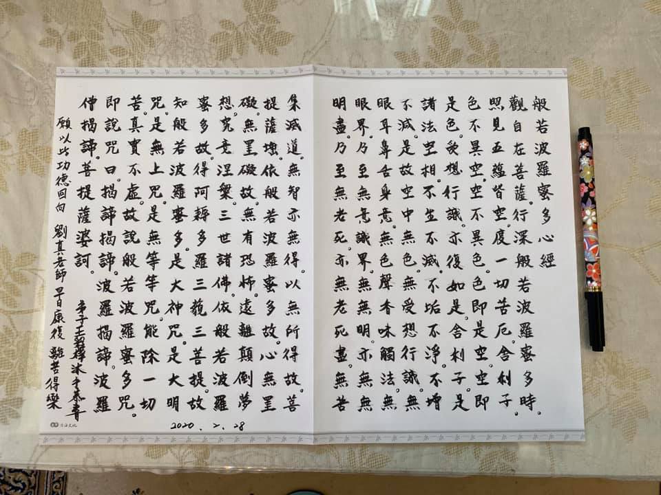 ▼王彩樺po出書法手抄心經照片,祈求諸佛菩薩保佑劉真老師早日康復。她還請在印度的上師菩曼仁波切為劉真老師念經祈福:「也在印度寺廟點108盞燈,寫了一篇心經為劉真老師祈福,《劉真老師》辛苦了加油,我們在等你喔。」最後她喊話辛龍:「辛龍您辛苦了加油,一定會撐過去的,我們都在您身邊…也請大家幫劉真老師集氣!謝謝你們。」