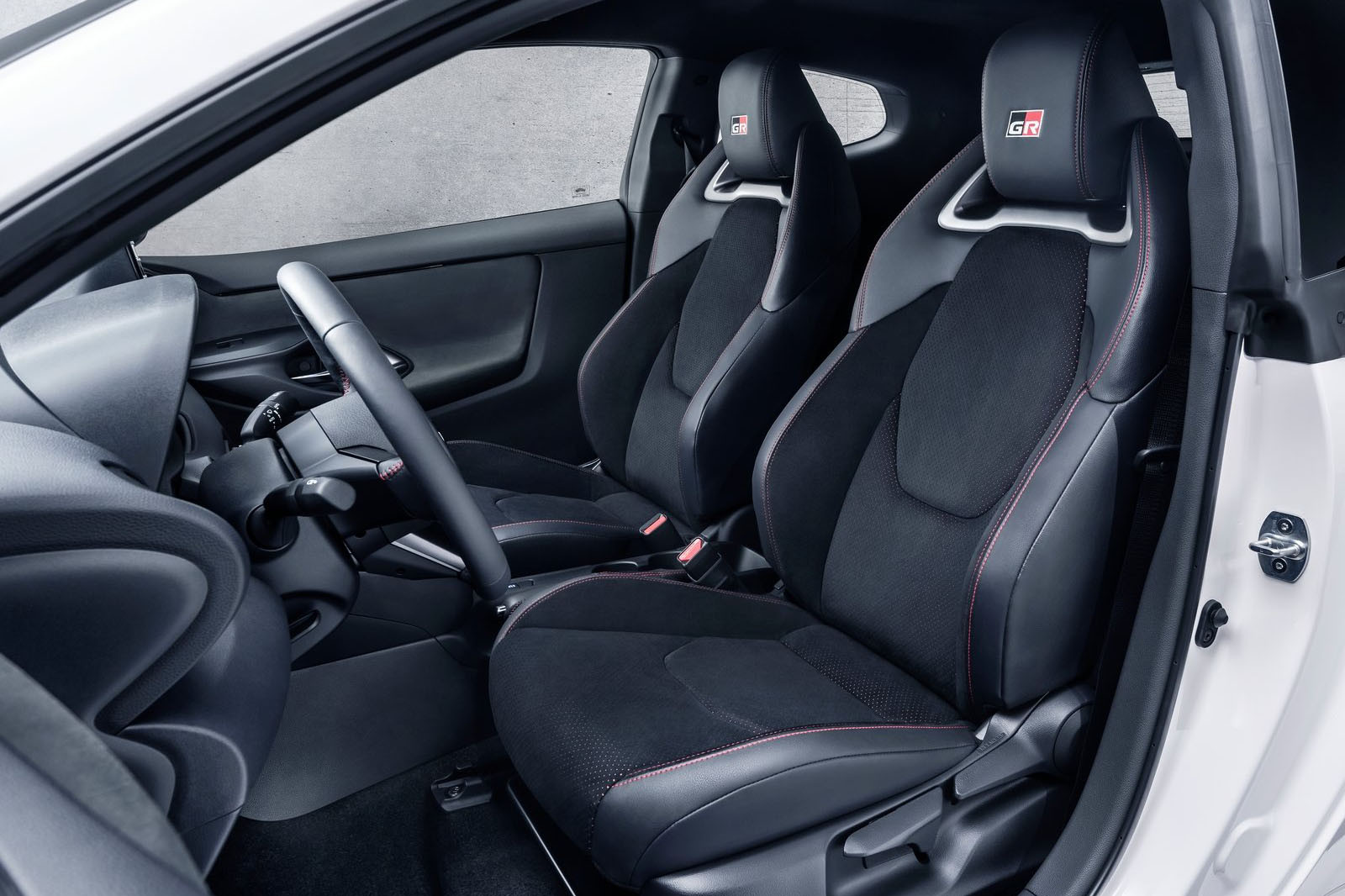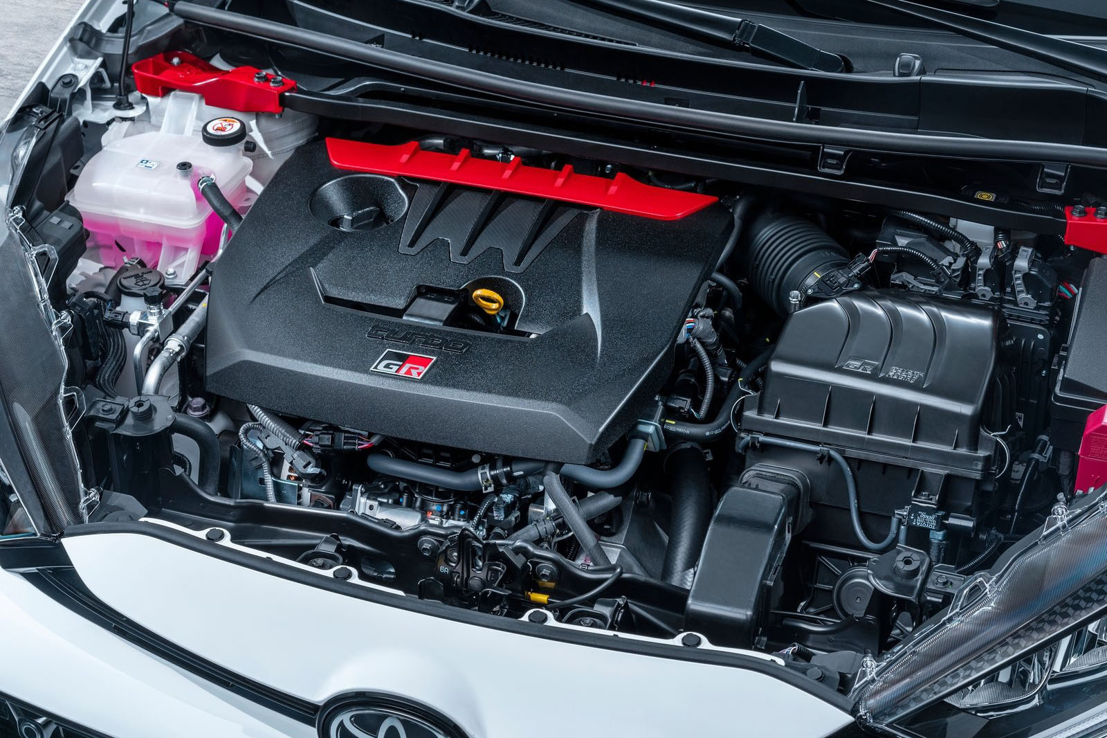 ▼車內多處有GR專屬銘牌,還有麂皮混搭皮質的跑車化座椅,運動感十足。排檔座前方是模式切換旋鈕,還有「Track」賽道模式,這在其他TOYOTA車款中很少見。GR Yaris採用1.6升3缸渦輪引擎,實際排氣量為1618c.c.,可輸出272匹馬力。