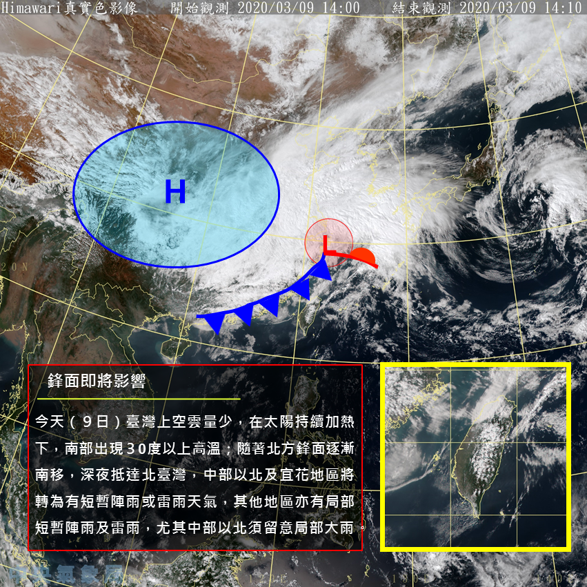 9日週一全台有雨,深夜鋒面接近氣溫下降,週二10日天氣因鋒面的通過和東北季風增強,全台各地轉為陣雨、雷陣雨,尤其以北部、東北部及東部降雨較為明顯,有局部大雨發生的機率,氣溫越晚越冷。週三(3/11)為最冷,北台灣氣溫僅14、15度,週四(3/12)恢復穩定回暖;週五(3/13)下午起到週六(3/14)因第二波冷空氣南下,中部以北有、南部有局部短暫雨,各地氣溫會驟降。