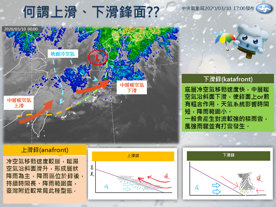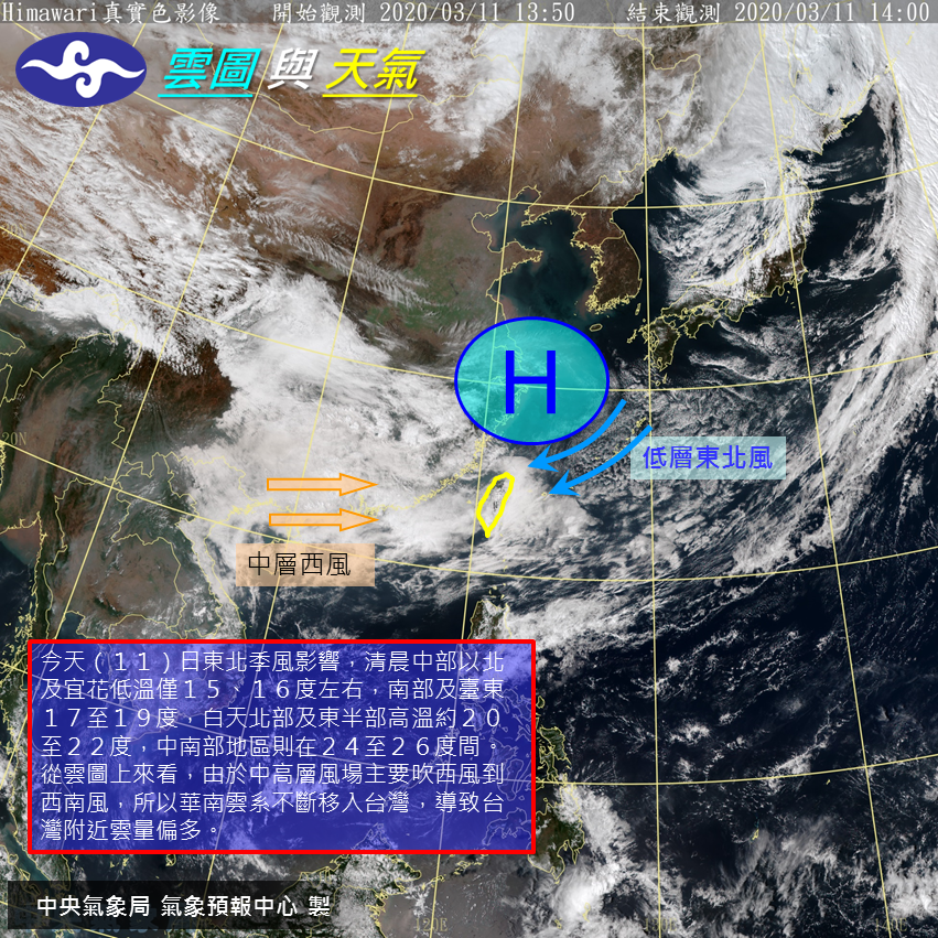 2020年03月12日據氣象局觀測,週五(13日)有一鋒面經過,中部以北、東半部及南部山區有局部短暫陣雨。週六(14日)東北季風或大陸冷氣團南下,氣溫逐漸下降,有愈晚愈冷的趨勢,尤以北台灣為最明顯,為接下來6天內氣溫最低的一天。