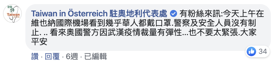 ▼駐奧地利代表處臉書後來有補充道,在維也納國際機場中幾乎許多華人都有戴口罩,警察及安全人員沒有制止,看來奧地利警方有因為武漢肺炎疫情的影響而有選擇裁量,希望民眾別太緊張,大家平安。