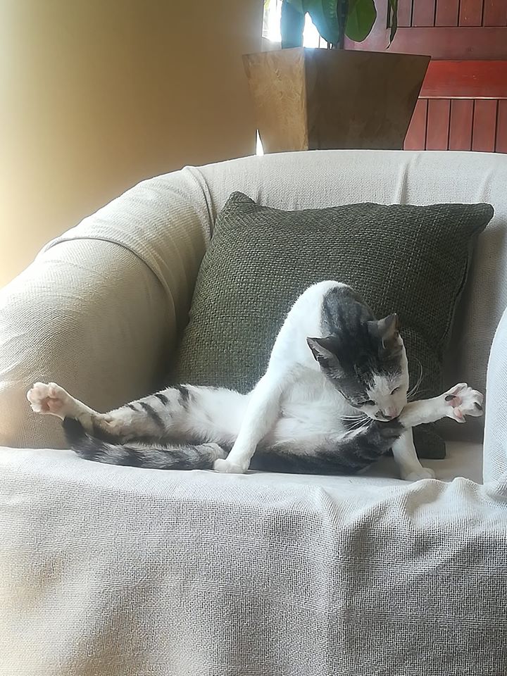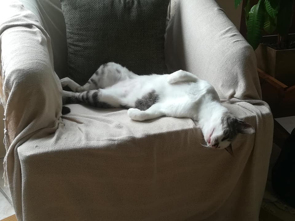 2020年03月13日毛孩擁有療癒人心的力量。國外網友Tamsyn Bouttell在臉書社團po文說,她有一天因為支氣管問題請假在家休息。她吃藥後躺在懶骨頭上昏睡過去,恍惚間感覺面前有一張毛茸茸的臉,結果一睜眼就看到一隻可愛的白底虎斑貓正躺在旁邊,深情凝視著她,但她根本沒有養貓啊!