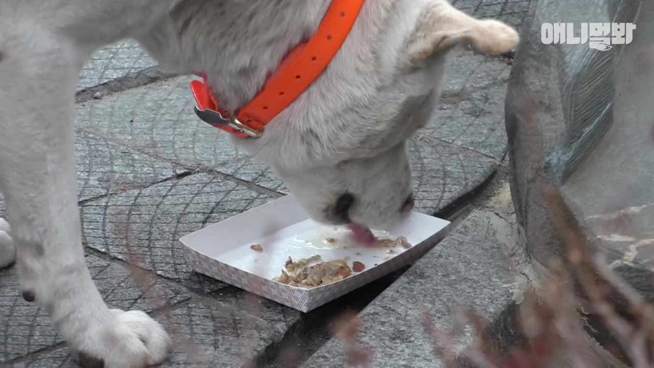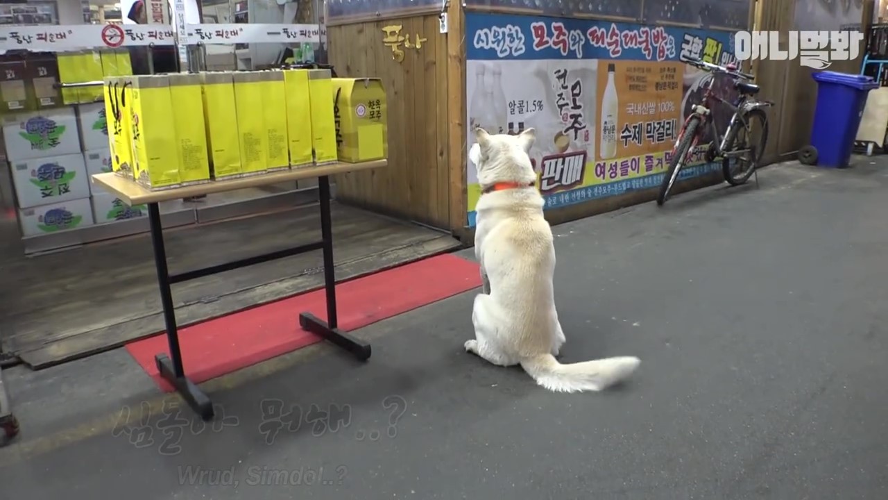 ▼Simdol來到小吃店門前對著老闆娘搖尾巴示好,善良的老闆娘就會拿出滿滿的一碗肉肉招待。因為Simdol常常來索要肉肉,有時甚至會吃掉兩碗肉肉,老闆娘一度認為飼主沒有餵飽牠。