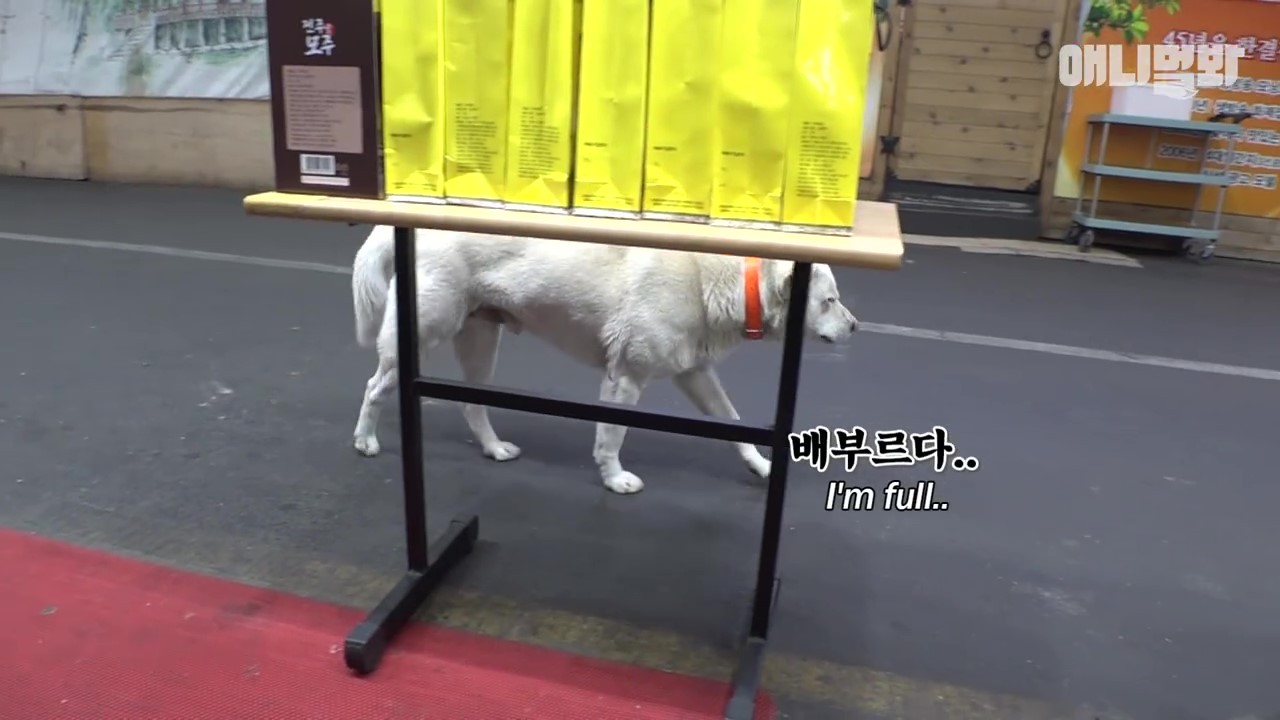 ▼節目組採訪了附近的店家才得知,Simdol常常一幅可憐的樣子來這裡乞討。挑嘴的Simdol只吃牛肉餅不吃魚板,吃飽喝足後就心滿意足的離開了。