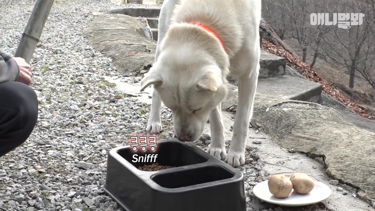 ▼Simdol(심돌이)生活在寺廟4年了,溫和的牠一直「清心寡食」。Simdol與寺廟中的弟子一樣「齋戒」,飯食都是清淡的馬鈴薯、地瓜和飼料。