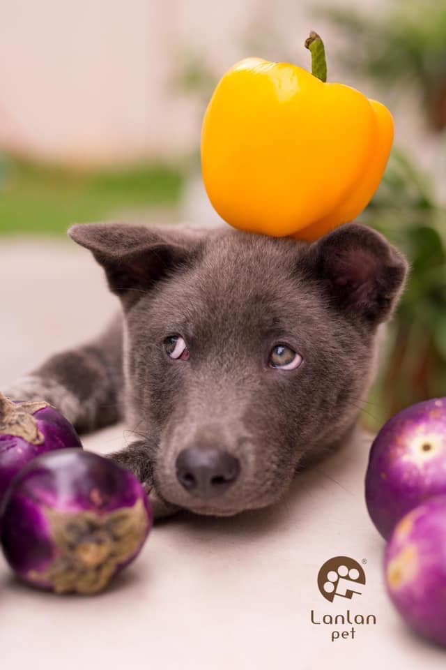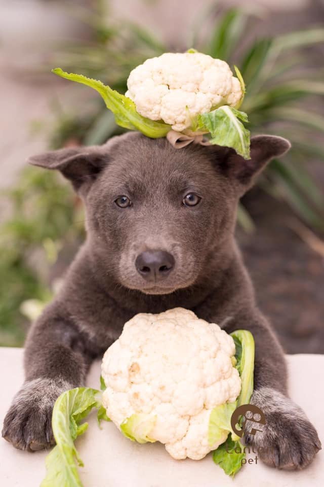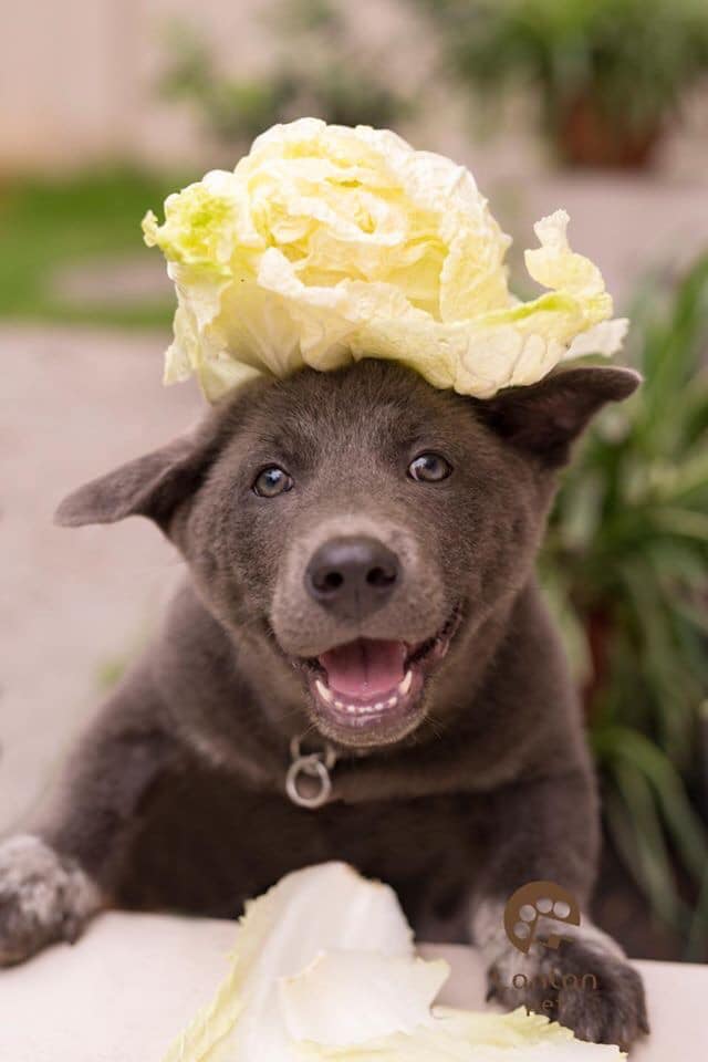 ▼不管是花椰菜、紅蘿蔔,還是高麗菜,狗狗都能將它們穩穩頂在頭上。