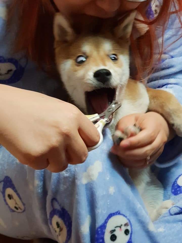 ▼飼主讓柴柴躺在自己的大腿上,開始給牠剪指甲。但每次碰到牠的指甲,牠都忍不住大喊大叫,連白眼都出來了。