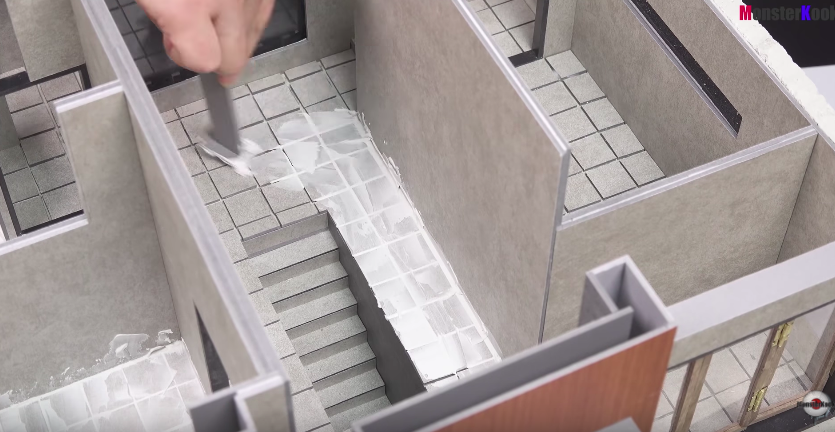 ▼門做好後開始製作地面磁磚,就連美縫防水層都做了。這是電影中那一條非常有名的樓梯!