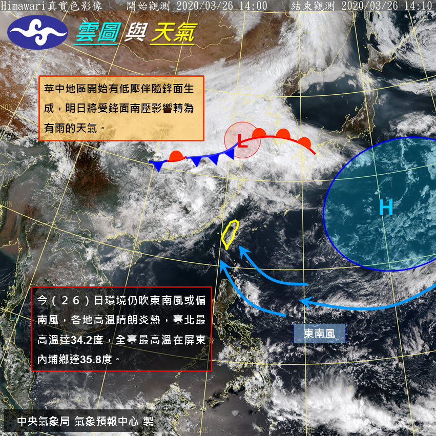 2020年03月27日最近天氣較暖,但是要稍微注意了,因為週末即將要變天!氣象局報導,週五(27日)晚開始到週六(28日)清晨,因為鋒面通過,會有降雨,以中部以北和東北部較為明顯,要多留意局部陣雨,可能會有較大雨勢。