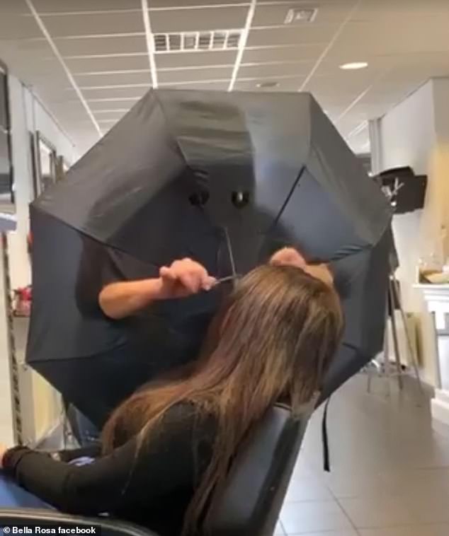 ▼這位髮型師在雨傘上挖了4個洞,其中2個大洞能夠伸出手,操作剪刀、梳子;另外兩個小洞處於眼睛的位置,正好用來觀察客人的髮型。網友們看到後大讚髮型師有創意,但也有人懷疑這樣的措施效果並不好,只是自我安慰罷了。