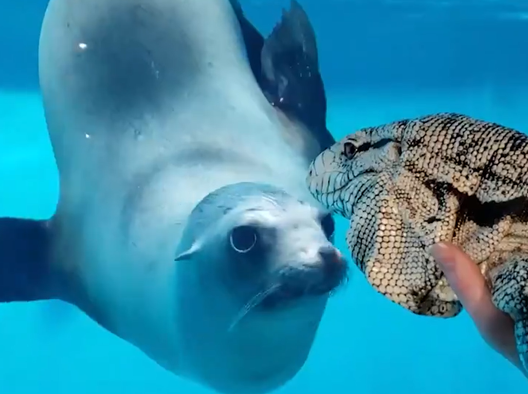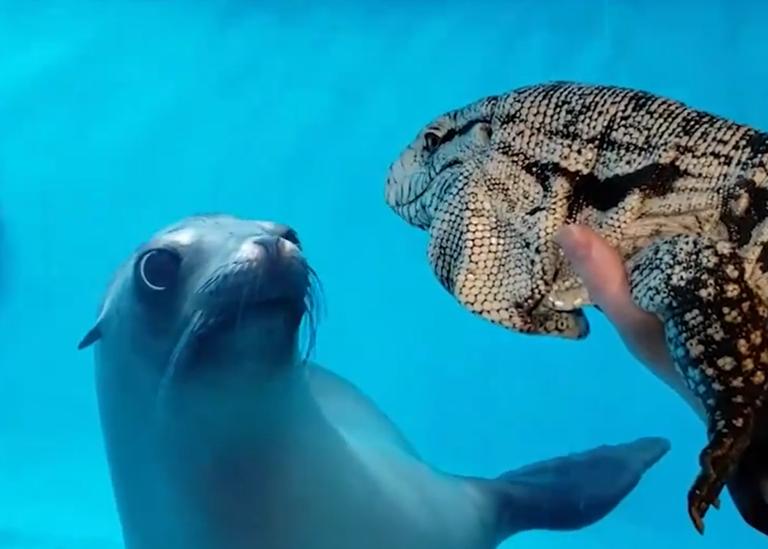 2020年04月07日美國很多公共場所都關閉了,動物園和水族館也暫時閉館。康乃狄格州的神秘水族館(Mystic Aquarium)中上演了超有趣的一幕,飼養員趁著閉館竟安排海獅和蜥蜴見面,海獅的反應太萌啦~