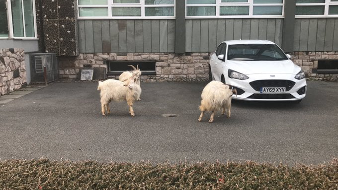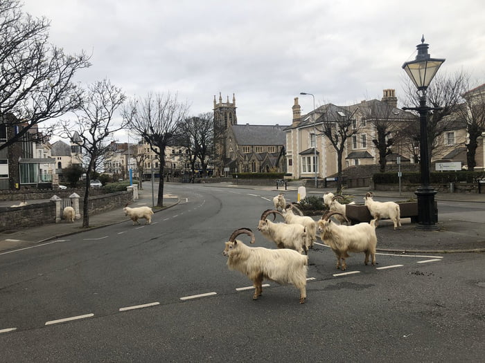 2020年04月02日為防止新冠疫情的蔓延,英國已經開始「封城」,街頭人煙稀少。原本生活在郊外的動物們趁此機會來到城市中,大搖大擺在人類的地盤遊蕩。威爾斯蘭迪德諾(Llandudno)的網友就看到成群山羊在市區逛大街,那畫面有點滑稽,也非常可愛。