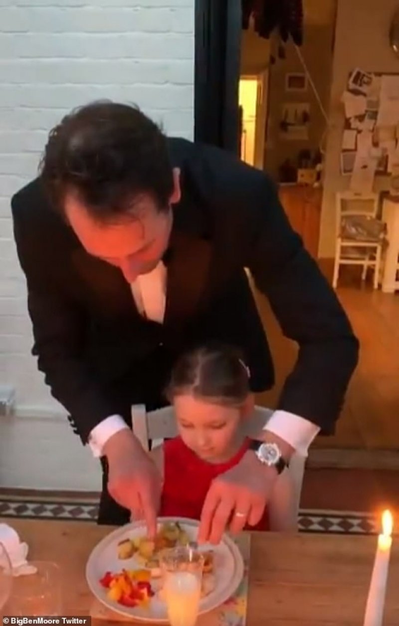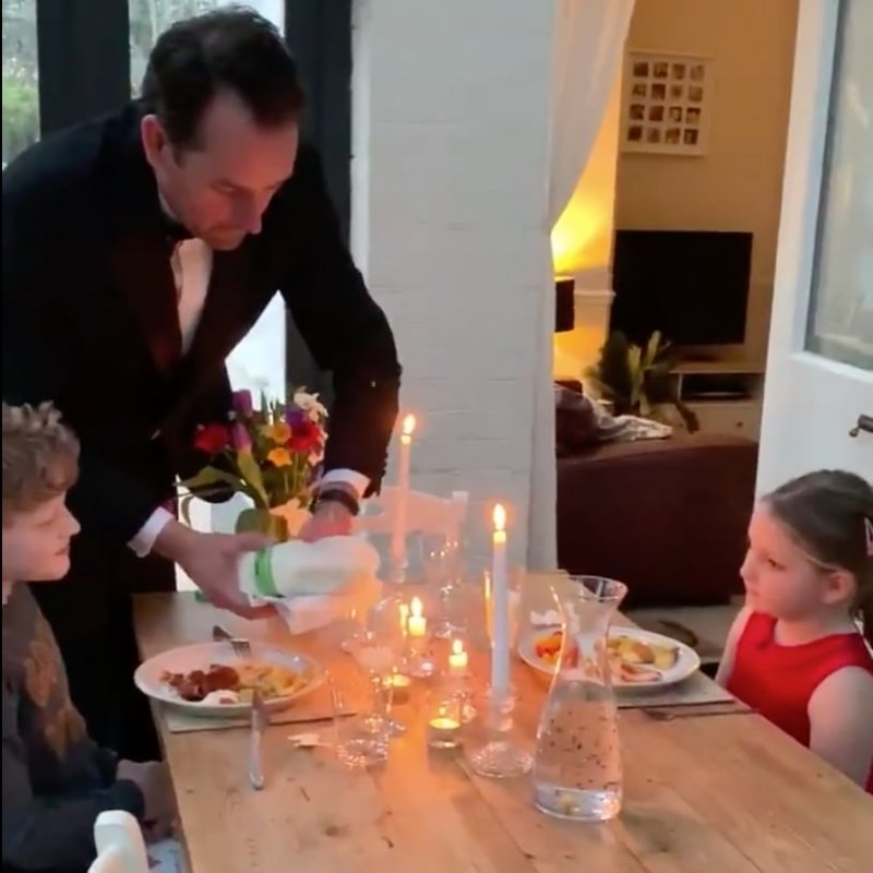 Moore裝扮成餐廳服務生非常專業,他家的小孩也很懂餐桌上的禮節。小孩用牛奶代替紅酒,搖杯、品酒等動作都非常到位,看來這已經不是第一次跟爸爸玩餐桌遊戲了。這樣溫馨的親子日常看一整天都不會覺得無聊。