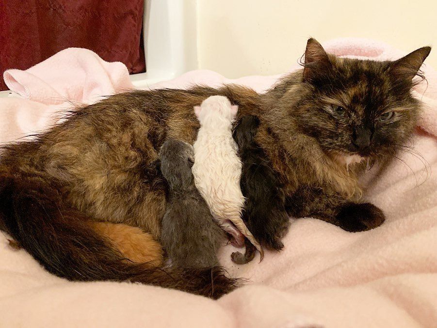 2020年04月15日在美國的北卡羅萊納州詹姆士鎮(Jamestown)有一位屋主,在自家屋外發現的來了一隻外來貓,他詢問鄰居是否有人飼養這隻貓,結果沒有人來認領牠,但過了幾天後,在下了一陣大雷雨的同時,這隻浪貓升格做了貓媽媽,牠生下了一窩小貓。
