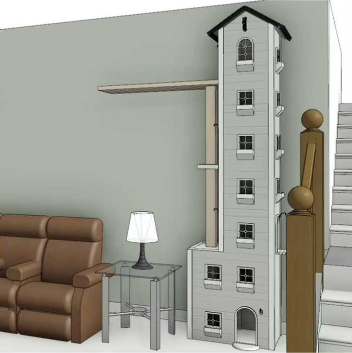 ▼Rob親自設計、製造了2座5層高的塔樓。塔樓非常精緻,有門廊、陽台、飄窗等等,每一層都有供貓咪玩樂的空間。