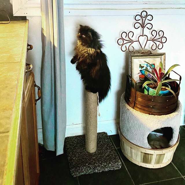 ▼Samantha覺得Salem蹲在貓爬架上的模樣很好笑,忍不住拿出手機拍攝下來。Salem沒有起跳,牠可能有點尷尬,很快就爬下來去找主人撒嬌了。
