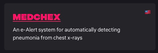 2020年04月14日由世界衛生組織WHO所舉辦的「國際COVID19科技駭客松大賽」,由台灣成功大學所組成的五人團隊「MedCheX」榮幸獲選,成為台灣唯一優勝隊伍。團隊研發能一秒判讀COVID-19肺部X光片的AI,受評審青睞,並登上主辦單位的網站,「MedCheX」隊伍讓國旗登上國際網站。