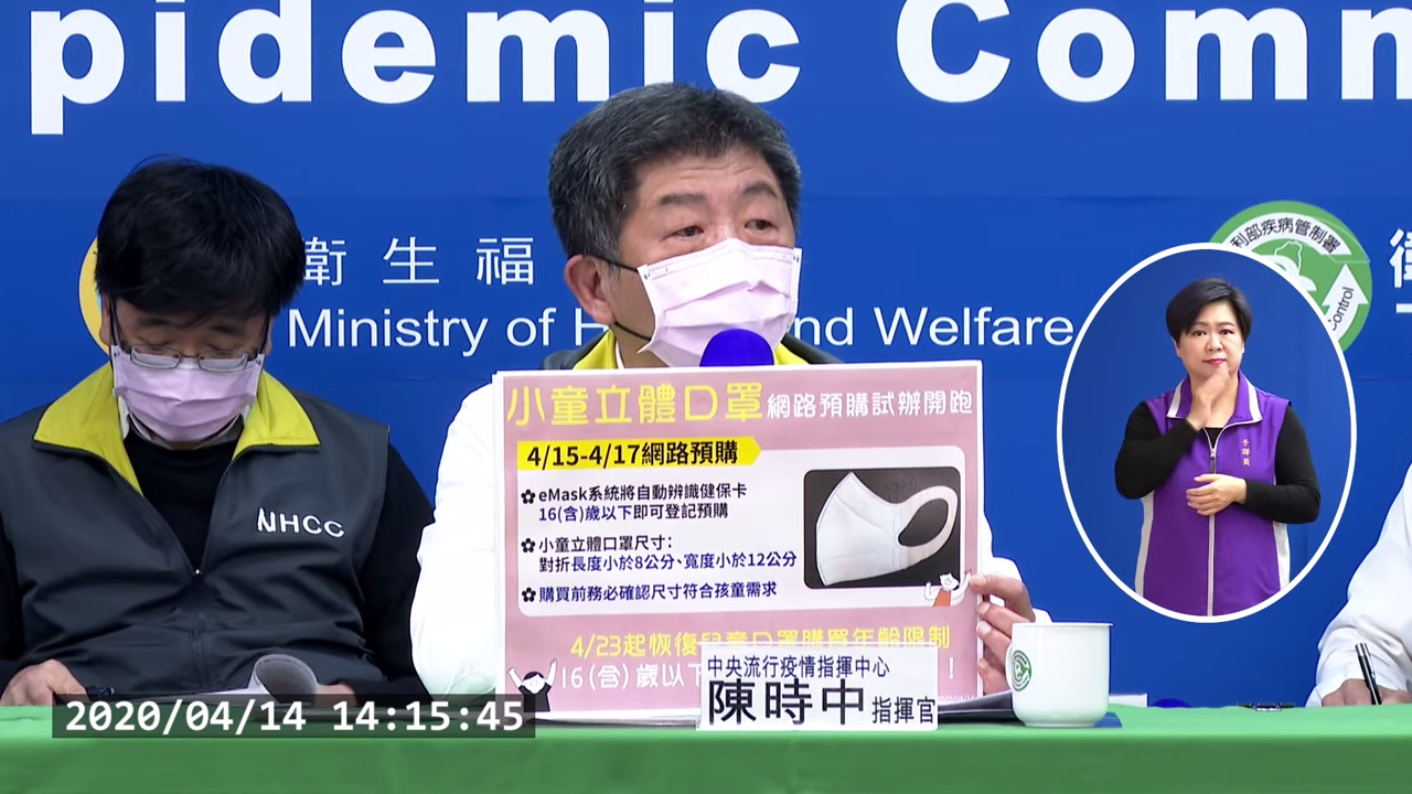 2020年04月14日中央指揮中心於4月14日記者會發布,在連續36天的確診數增加後,睽違一個月餘,台灣終於再度達成「單日0確診」的好消息。指揮中心並公布15日起開放可網購孩童尺寸的口罩,並於23日起恢復兒童口罩購買年齡的限制。