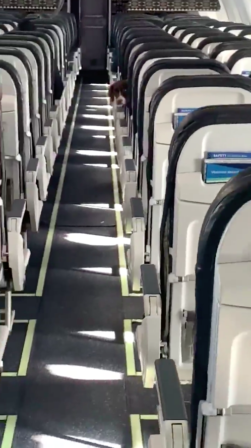 ▼飛機上只有6個人,Jenn非常空閒,所以能拿出很多時間跟狗狗玩耍。「我在走道上走來走去,牠就轉頭盯著我看。我們還大玩躲貓貓,從座位邊突然探出頭,玩得很開心。」