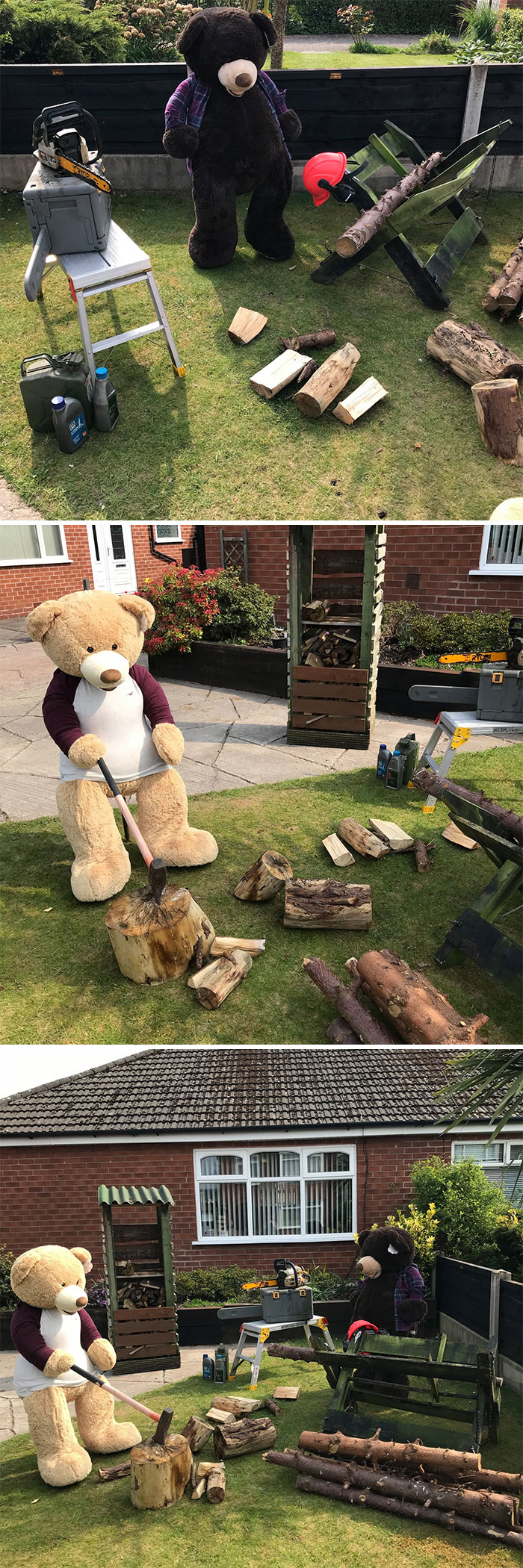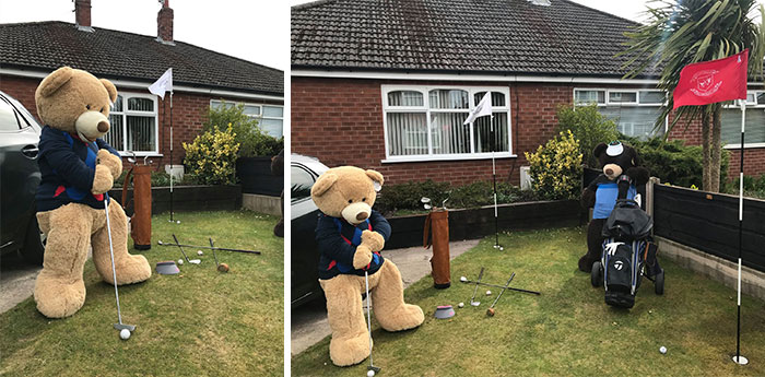 隔離也不無聊!巨大泰迪熊「草皮過隔離日常」 鄰居看到笑:有同感~