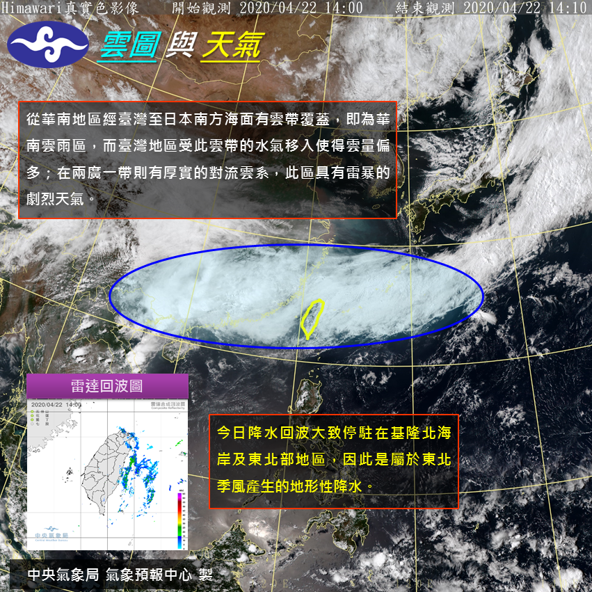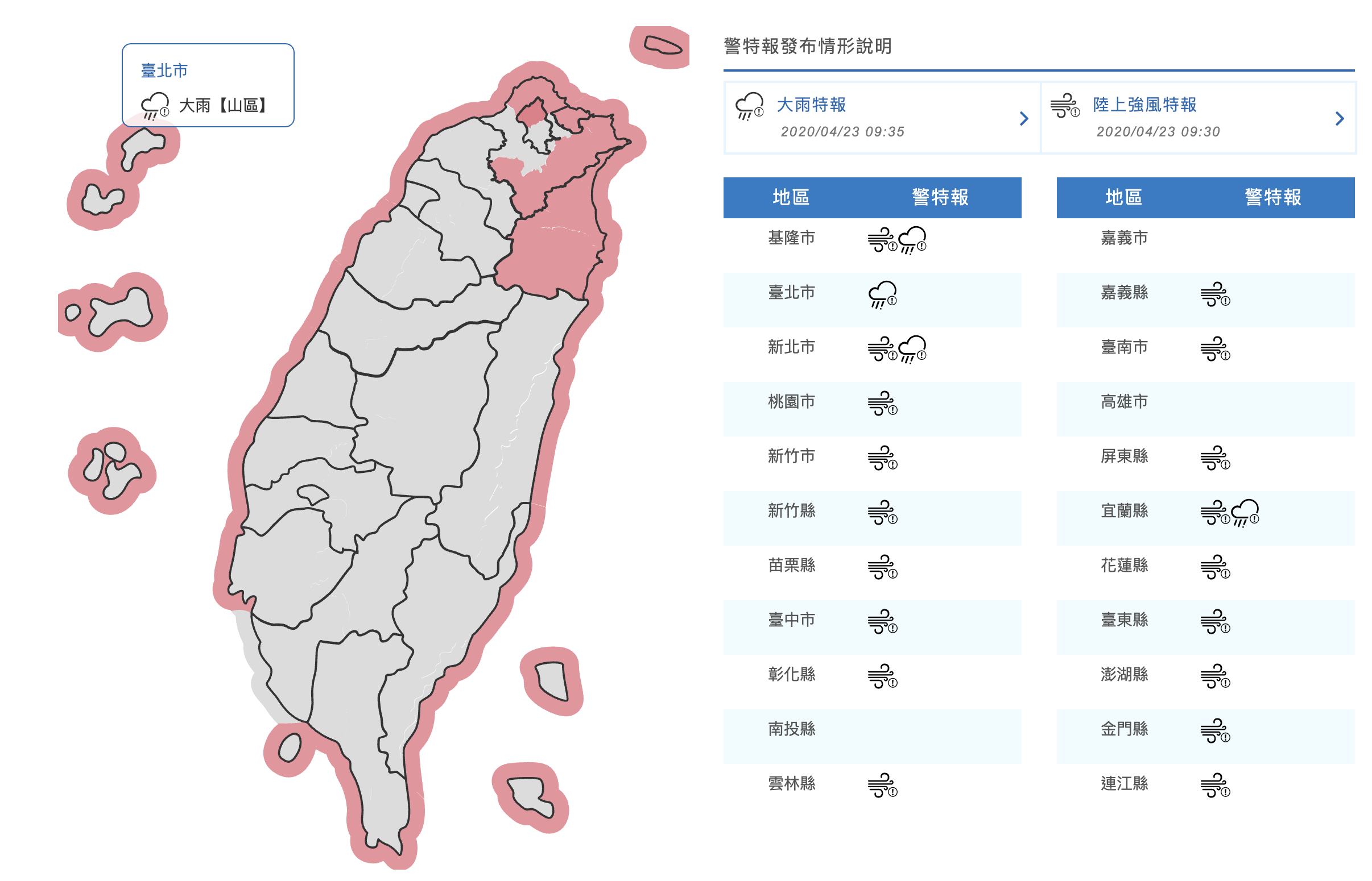 2020年04月23日已經到了四月底,最近天氣似乎還沒有要完全回暖,受到東北季風及華南雲雨區的影響下,中央氣象局23日發布了天氣警特報,宣布基隆、台北、新北、宜蘭有大雨發生的機率預告。還有陸上強風特報,因為東北風偏強,全台除高雄外沿海空曠處、澎湖、金門、馬祖都有強陣風,臨海會有較大風浪,請民眾多加注意。