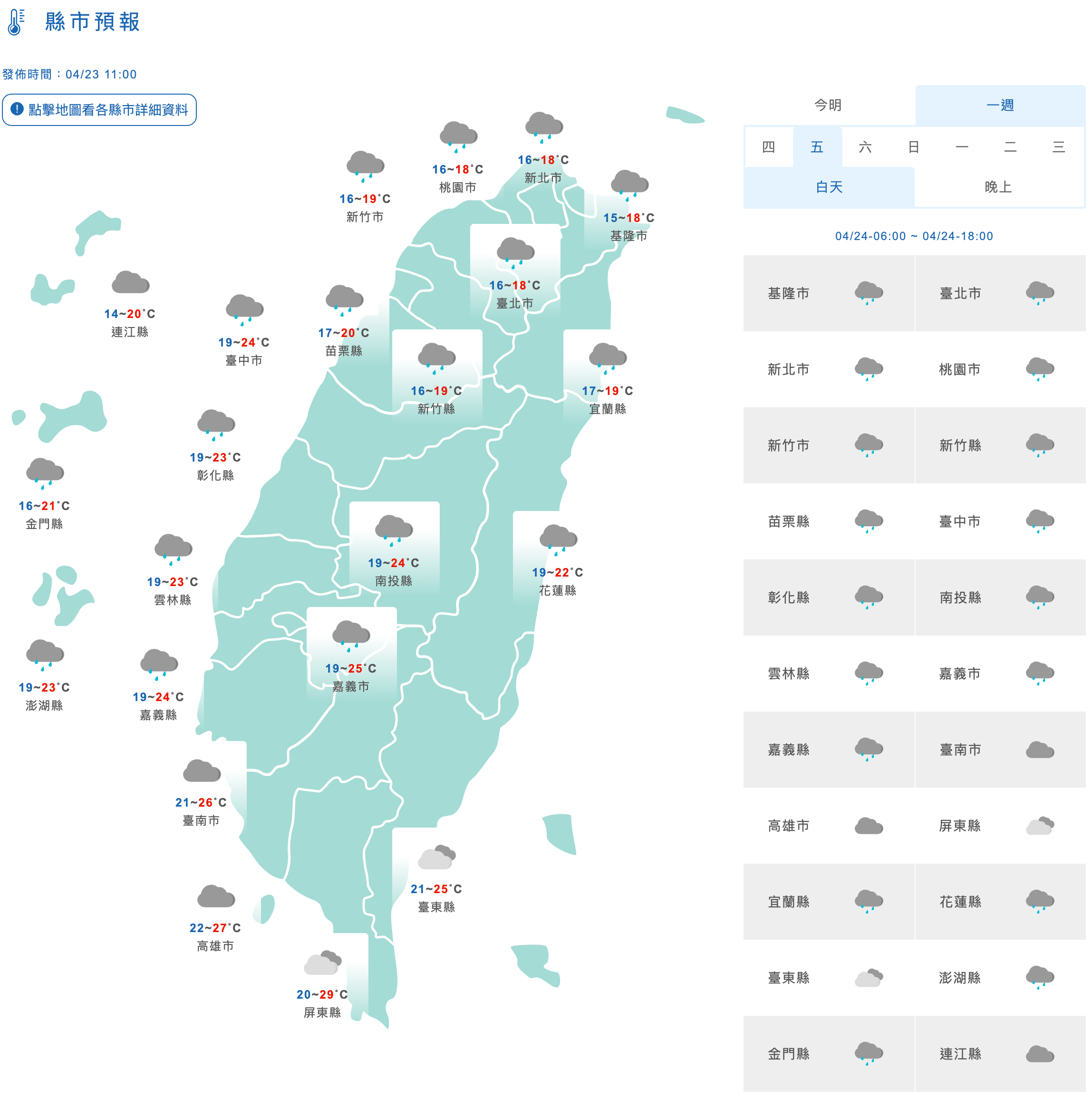 ▼氣象局表示,23、24日(週四、五)東北季風影響,北部及東北部天氣較涼,其他地區早晚亦涼。因為華南雲雨區往東移,水氣較為豐足,23日北部、東半部地區會有局部短暫陣雨;24日北部及東半部地區有短暫陣雨,其他地區有局部短暫陣雨或雷雨發生,中部以北及東北地區有局部大雨發生機率。