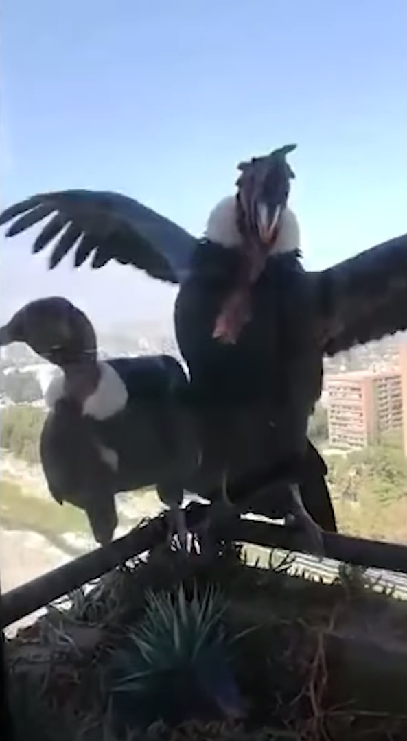 ▼這2隻巨鳥是安地斯神鷹(Andean condor),這種猛禽一般棲息在高海拔地區,幾乎不會在城市中現身。沒想到這次牠們跑到了人類的住所,站在窗外跟人類面對面。專家認為這2隻安地斯神鷹可能正在覓食,被小狗吸引才落到公寓的陽台上,貼著窗戶朝狗狗猛看。